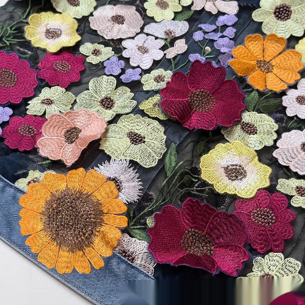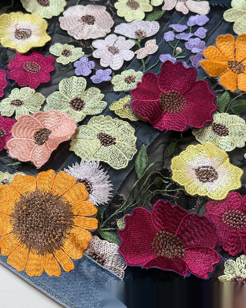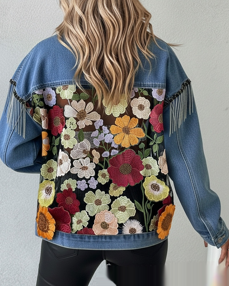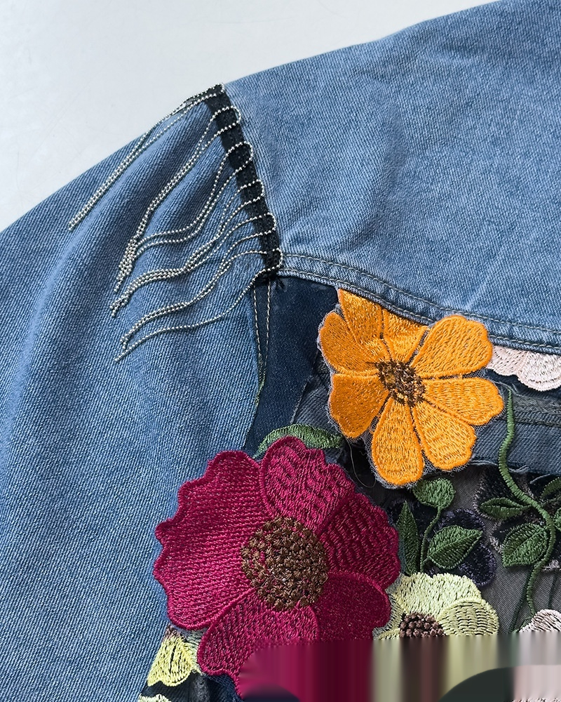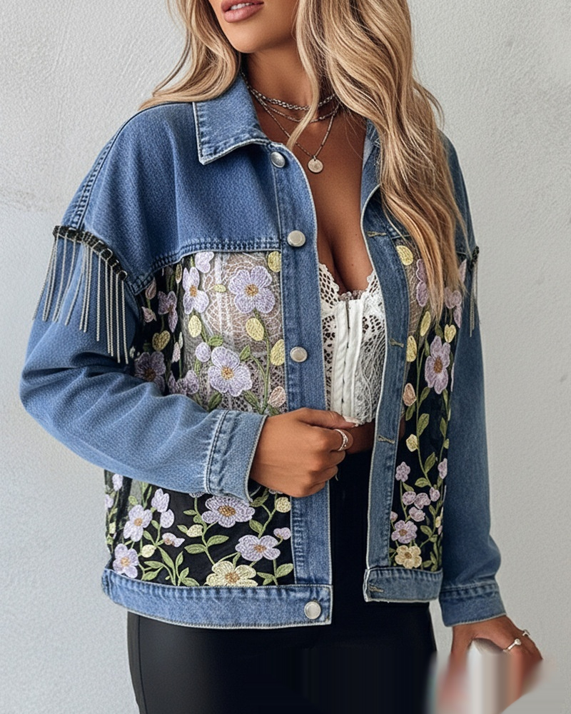 Blue Casual Denim Jacket With Embroidered Floral Lace Panels And A Turn Down Collar