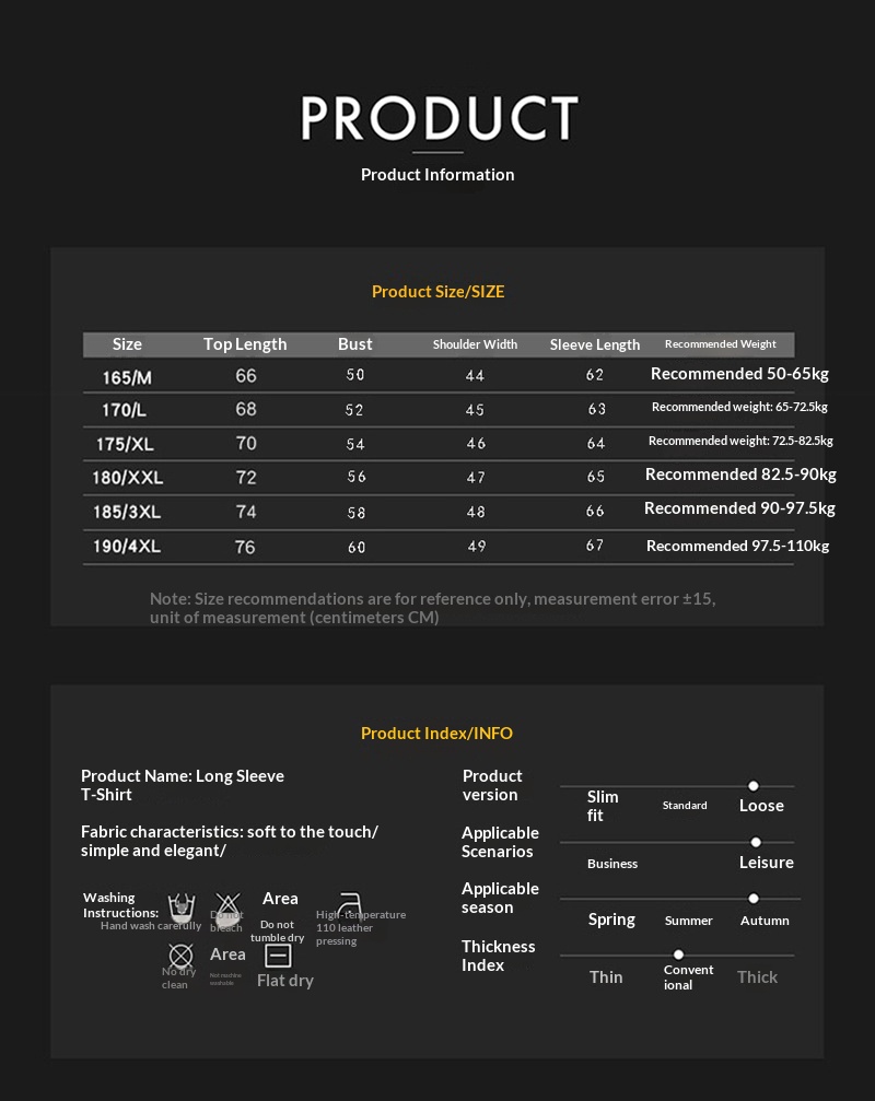 Sizes: 165/M, 170/L, 175/XL, 180/XXL, 185/3XL